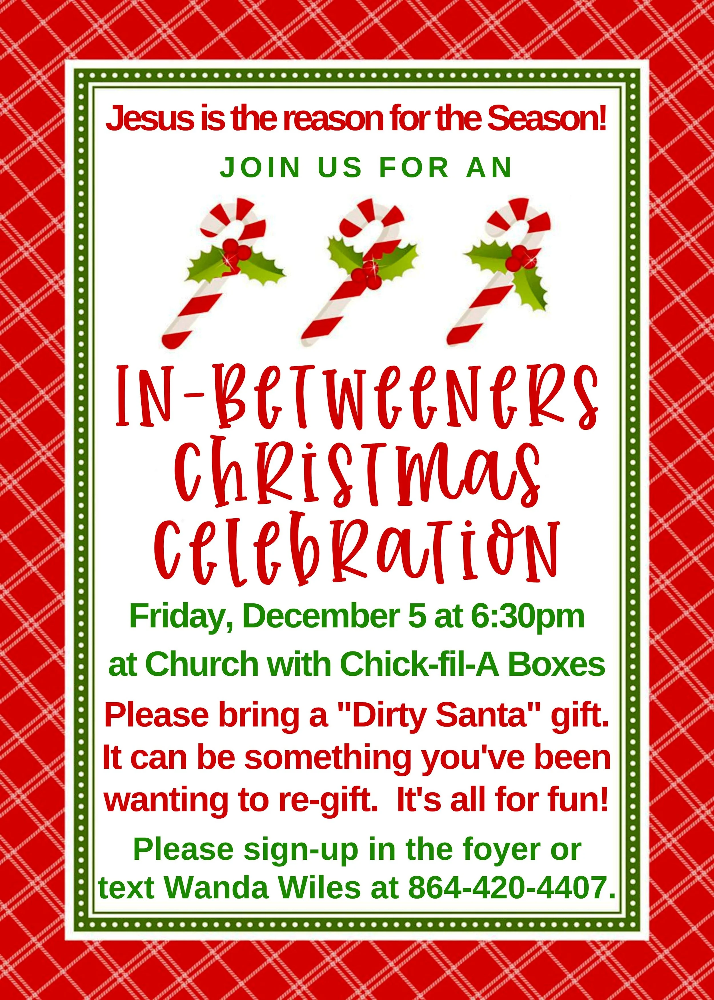 Please sign up in the foyer or text Wanda Wiles so that an accurate count can be made for Chick-fil-a boxes.